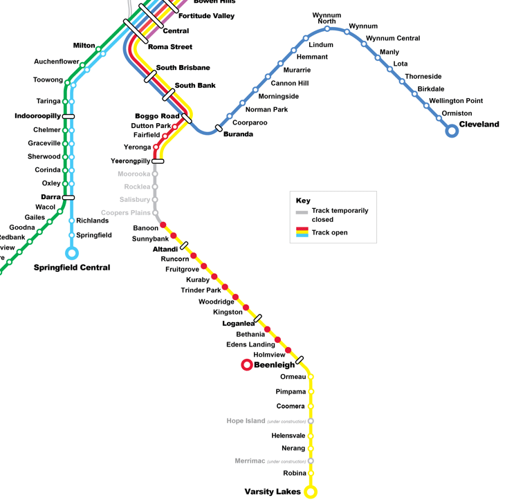 Rail replacement buses will be operating between Yeerongpilly and Banoon station with trains on the Gold Coast running as a combined all stop service with the Beenleigh line between Banoon and Varsity Lakes stations.